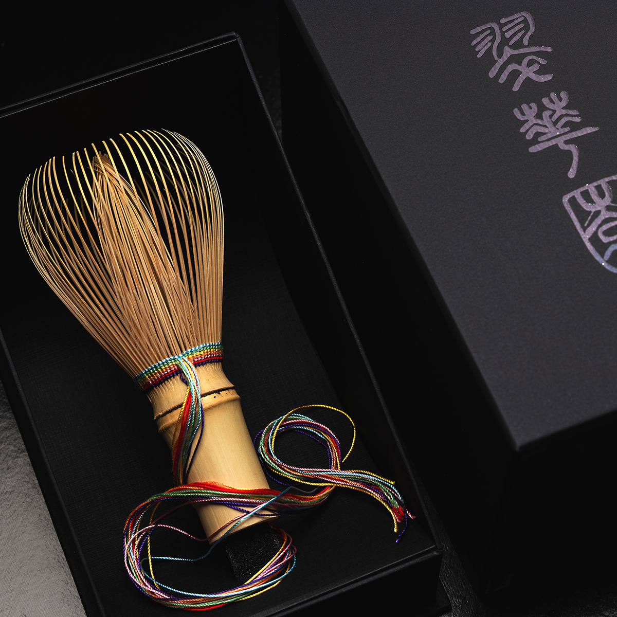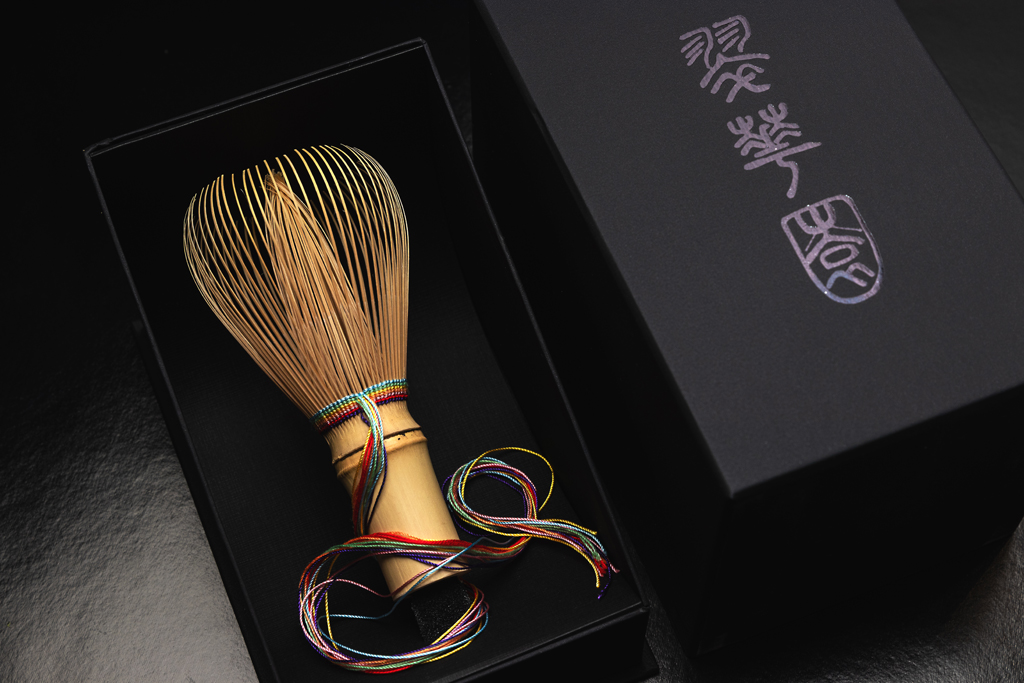 This chasen is a real piece of art and a signature chasen by the 25th generation chasen-maker Yasaburo Tanimura from Takayama, Nara Prefecture. It is made in shin (“true”) style of whisk that does not have curled tips. Henon bamboo from Kinki region is used, and transformed during the six year period into this gorgeous whisk. To embelish the matcha making process and add to it an extra flair. Its string is made of a kaleidoscope of 7 colors, and left uncut forming a seducing tail.